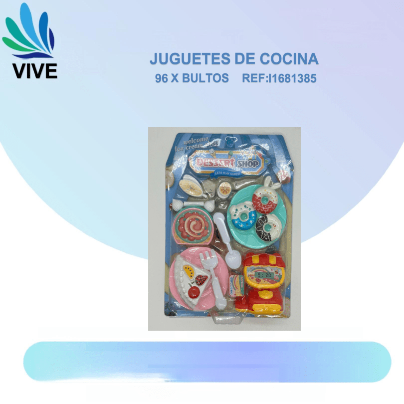 El Set de Juguete de Cocina es un producto ideal para ampliar tu catálogo de juguetes educativos y de entretenimiento. Este paquete incluye comida de juguete (helado, donuts, etc.) y utensilios de cocina, perfecto para fomentar la imaginación de los niños mientras juegan a preparar y servir sus platillos favoritos.